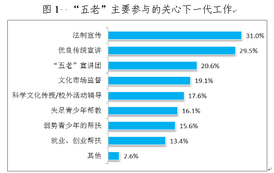 “五老”人群在關(guān)心下一代工作中發(fā)揮著重要的作用,他們承擔(dān)著眾多的工作項目(如圖1所示),特別是在當(dāng)前全面推進依法治國的時代背景下,“五老”同志突出抓好青少年的法制宣傳教育工作,約有31.0%的受訪“五老”參與了其中。“優(yōu)良傳統(tǒng)、薪火相傳”,有29.5%的受訪“五老”積極開展優(yōu)良傳統(tǒng)宣講活動。另外,受訪的“五老”同志還參與了“五老”宣講團、“文化市場監(jiān)督”、“科學(xué)文化傳授/校外互動輔導(dǎo)”、“失足青少年的幫教”、“弱勢青少年的幫扶”及“就業(yè)、創(chuàng)業(yè)幫扶”等活動,為關(guān)心下一代工作做出了重大貢獻。