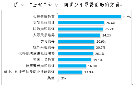 如圖3所示,“五老”認(rèn)為目前青少年最需要的幫助是,“心理健康教育”占比最高為36.2%,其次是“文明禮儀培訓(xùn)”、 “法律知識培訓(xùn)”、“人際關(guān)系培養(yǎng)”占大約25%左右的比例,接下來依次是“學(xué)習(xí)輔導(dǎo)”、“校外興趣輔導(dǎo)”、“優(yōu)秀傳統(tǒng)道德禮儀培養(yǎng)”、 “愛國主義教育”大約占20%左右的比例。
