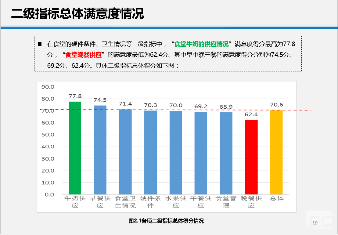 通過數(shù)據(jù)的統(tǒng)計(jì)分析,在20個(gè)局辦的調(diào)研中,坪山新區(qū)機(jī)關(guān)食堂總體滿意度屬于中等偏上。由于考慮到節(jié)約用餐等原因,晚餐的供應(yīng)更多是中午的剩菜,造成就餐干部職工對晚餐供應(yīng)的滿意度最低。報(bào)告中將此類問題分析后匯總給出相關(guān)建議。