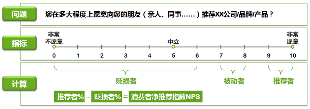 請(qǐng)用戶回答“您在多大程度上愿意向您的朋友(親人、同事……)推薦XX公司/產(chǎn)品?”根據(jù)用戶的推薦意愿,將用戶分為三類:推薦者(得分在9-10之間)、被動(dòng)者(得分在7-8之間)、貶損者(得分在0-6之間)。