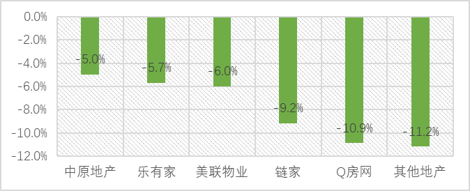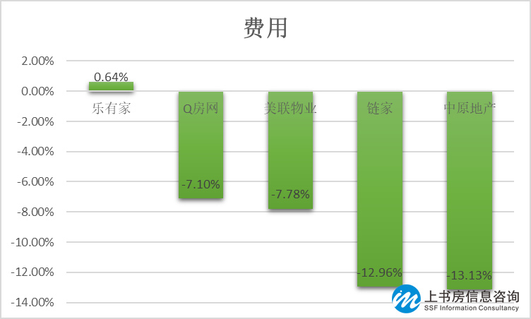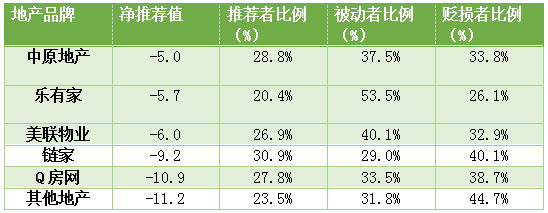 樂有家(原家家順)在費(fèi)用方面凈推薦率最高,為0.64%;排名最末為中原地產(chǎn),為-13.13%。這一項(xiàng)整體的凈推薦率較差,也說明消費(fèi)者對(duì)于房地產(chǎn)中介行業(yè)的費(fèi)用情況整體的推薦度不高。