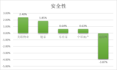 美聯(lián)物業(yè)在安全性方面凈推薦率最高,為2.4%;而鏈家也在其之后為1.85%,受到了顧客的肯定;Q房網(wǎng)的安全性凈推薦率最低,僅為-3.87%。