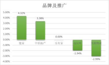 鏈家在品牌推廣方面,相對(duì)于其他地產(chǎn)中介,凈推薦率最高,超過4.0%。各品牌之間差距較大。