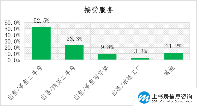 本次調(diào)研受訪者買方/租戶的占比為69.0%,業(yè)主的比例為31.0%,受訪者接受的中介服務(wù)以出租/承租二手房為主,占比達(dá)到五成以上;其次是出售/購買二手房,占比為23.3%。