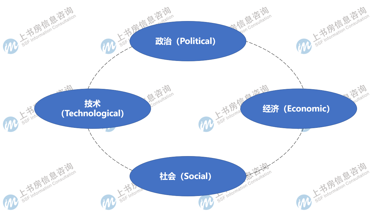 以上這些研究也稱為PEST分析法,即通過對目標(biāo)市場的宏觀環(huán)境進行分析。主要研究影響行業(yè)和企業(yè)的宏觀因素,一般包括政治(Political)、經(jīng)濟(Economic)、社會(Social)和技術(shù)(Technological)這四大類影響因素。