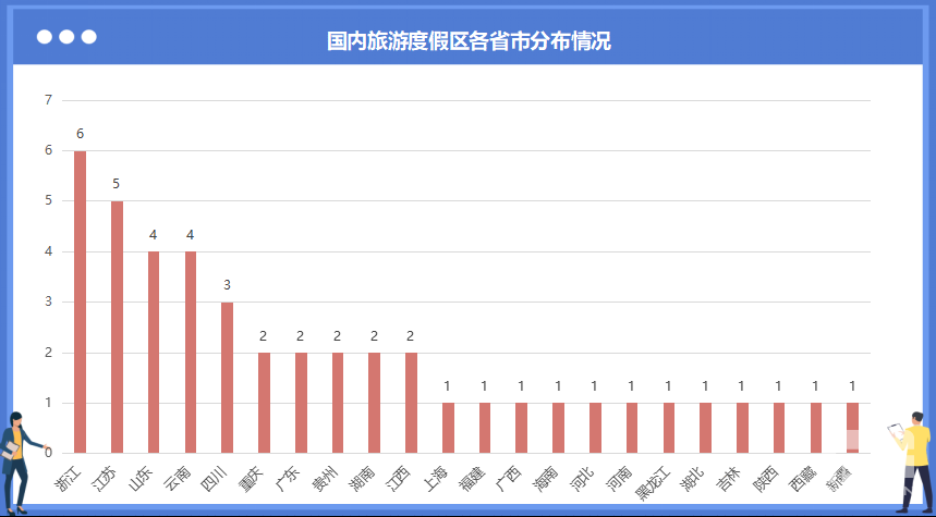 國內旅游度假區(qū)最多的省份是浙江省,為6個,其次是江蘇省,為5個。TOP10的省份還有:山東省、云南省、四川省、重慶市、廣東省、貴州省、湖南省、江西省。