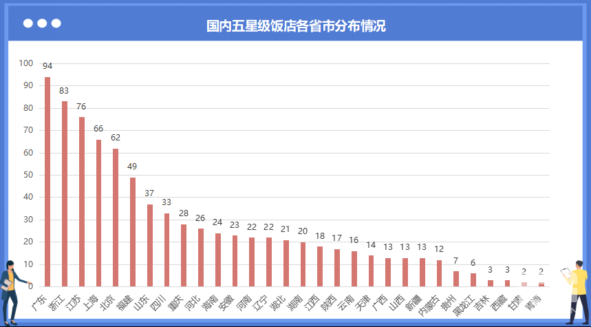 國內五星級酒店最多的省份是廣東省,為94個,其次是浙江省,為83個。TOP10的省份還有:江蘇省、上海市、北京市、福建省、山東省、四川省、重慶市、河北省。