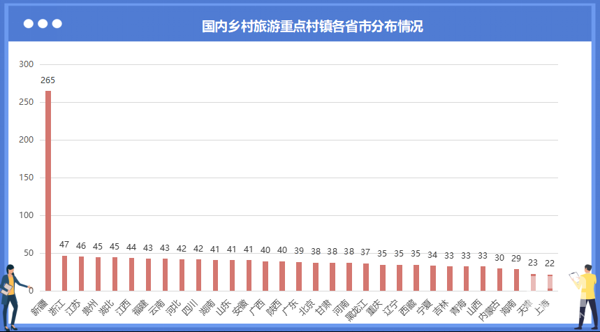 國內鄉(xiāng)村旅游重點村鎮(zhèn)最多的省份是新疆,為265個,其余省市鄉(xiāng)村旅游重點村鎮(zhèn)數(shù)量在20-50個之間。