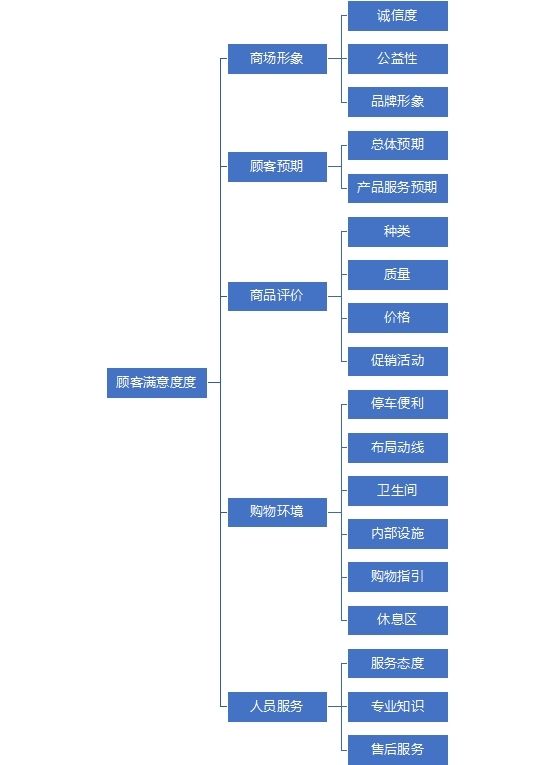 (2)通過顧客滿意度則評(píng)研究,了解消費(fèi)者體驗(yàn)和需求情況,從而針對(duì)性制定改善措施和營(yíng)銷策略,維護(hù)顧客關(guān)系,優(yōu)化營(yíng)銷組合策略,以提升百貨商場(chǎng)應(yīng)對(duì)市場(chǎng)變化的能力。商場(chǎng)顧客滿意度測(cè)評(píng)指標(biāo)的設(shè)計(jì)