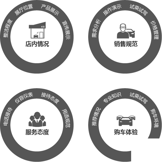 基于上述檢測(cè)售后服務(wù)檢測(cè)內(nèi)容,不同品牌的神秘顧客檢測(cè)會(huì)根據(jù)自身品牌要求,設(shè)置不同的檢測(cè)考察標(biāo)準(zhǔn)。深圳神秘顧客(SMS)是專業(yè)通過(guò)神秘顧客方式來(lái)了解4S店的銷售服務(wù)、銷售價(jià)格等方面管理情況。從廳外環(huán)境→廳內(nèi)設(shè)施→宣傳信息→進(jìn)店問(wèn)候/接待→儀容儀表→服務(wù)態(tài)度→產(chǎn)品講解和咨詢→解答客戶咨詢→離店回訪等方面設(shè)計(jì)檢測(cè)指標(biāo),并通過(guò)錄像錄音方式進(jìn)行檢測(cè),保證全流程有據(jù)可查。