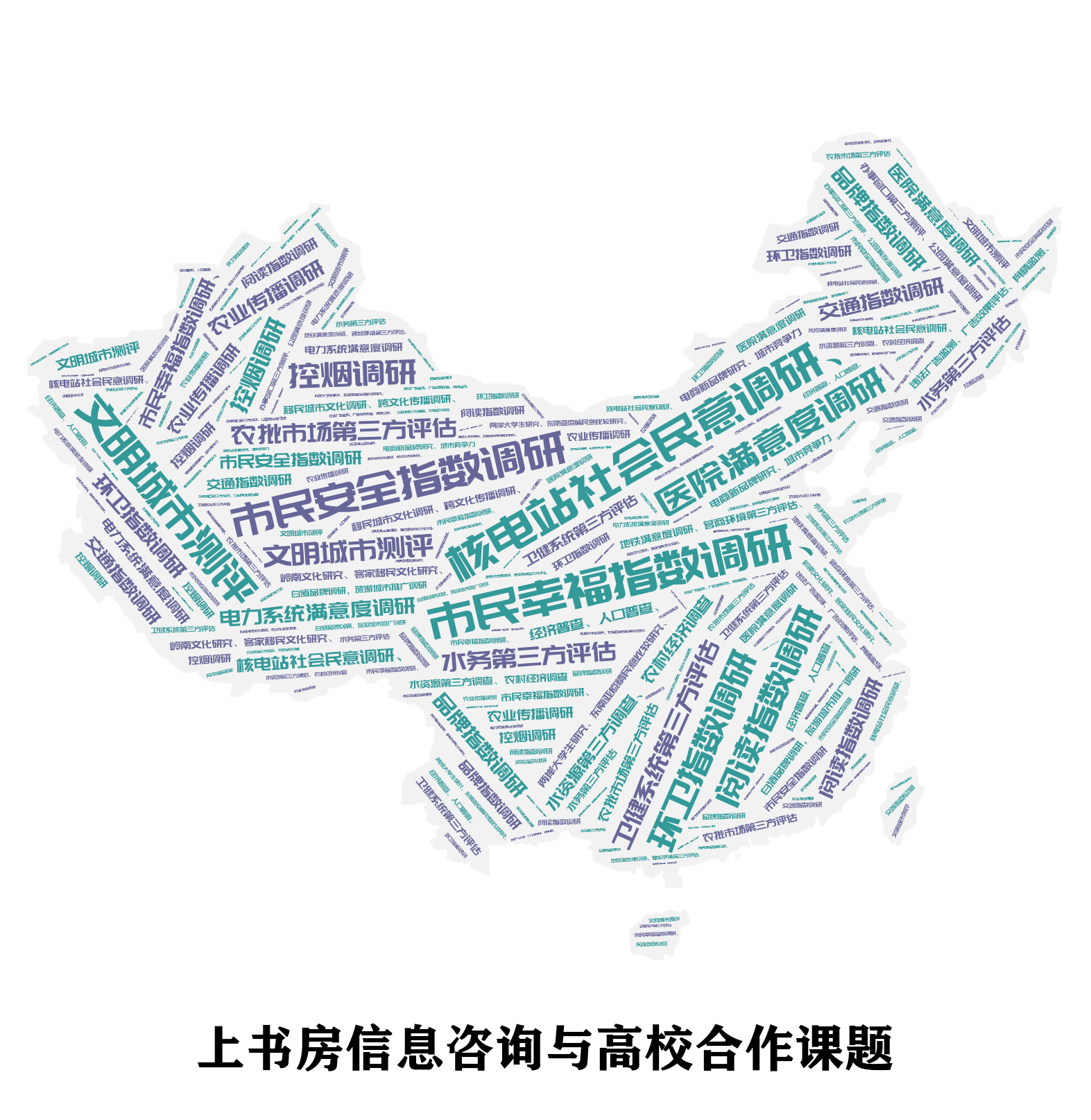 上書房信息咨詢?cè)?jīng)合作過(guò)的課題有:核電站社會(huì)民意調(diào)研、市民幸福指數(shù)調(diào)研、市民安全指數(shù)調(diào)研、文明城市測(cè)評(píng)、環(huán)衛(wèi)指數(shù)調(diào)研、閱讀指數(shù)調(diào)研、醫(yī)院滿意度調(diào)研、衛(wèi)健系統(tǒng)第三方評(píng)估、控?zé)熣{(diào)研、農(nóng)批市場(chǎng)第三方評(píng)估、水務(wù)第三方評(píng)估,電力系統(tǒng)滿意度調(diào)研、品牌指數(shù)調(diào)研、交通指數(shù)調(diào)研、農(nóng)業(yè)傳播調(diào)研、經(jīng)濟(jì)普查、人口普查、地鐵滿意度調(diào)研、營(yíng)商環(huán)境第三方評(píng)估、移民城市文化調(diào)研、跨文化傳播調(diào)研、兩岸大學(xué)生研究、東南亞疫情民意比較研究、嶺南文化研究、客家移民文化研究、違法廣告監(jiān)測(cè)、廣告效果評(píng)估、輿情監(jiān)測(cè)、電商新品牌研究、城市競(jìng)爭(zhēng)力研究、白酒品牌調(diào)研,旅游城市推廣調(diào)研、辦事窗口第三方測(cè)評(píng)、公園滿意度調(diào)研、水資源第三方調(diào)查、農(nóng)村經(jīng)濟(jì)調(diào)查等等