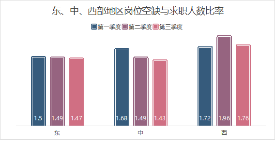 2.供求關(guān)系存在區(qū)域差異。東部市場(chǎng)供求人數(shù)有所減少,中、西部市場(chǎng)供求人數(shù)保持較快增長(zhǎng),中、西部地區(qū)市場(chǎng)用工缺口較大。