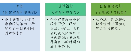 不同主體、不同報告對營商環(huán)境的定義各有差異,有簡有繁。于2019年10月在中國國務院通過,自2020年1月1日施行的《優(yōu)化營商環(huán)境條例》中,將營商環(huán)境定義為“企業(yè)等市場主體在市場經濟活動中所涉及的體制機制性因素和條件”。世界銀行認為,營商環(huán)境是指企業(yè)特別是私營企業(yè)在其壽命全過程中開設、經營、貿易活動、納稅、執(zhí)行合約及關閉等環(huán)節(jié)方面遵循政策法規(guī)所需付出的時間和成本等條件。世界經濟論壇的《全球競爭力報告》則是從全球生產力和長期經濟增長驅動力等方面衡量營商環(huán)境。