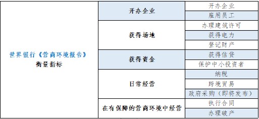 世界銀行《營商環(huán)境報告》主要通過十項定量和定性指標衡量全球190個經濟體的內資中小企業(yè)的營商難易程度,具體衡量其營商成本以及影響營商環(huán)境的法規(guī)制度的質量。在《2020年營商環(huán)境報告》中,“雇用員工”指標未包含在排名之中,“政府采購”指標將來可能會被納入。