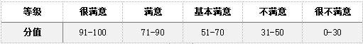 此外,借鑒國外測量用戶滿意度的有關理論和經驗,以上具體的因素都可分成很滿意、滿意、基本滿意、不滿意、很不滿意5個滿意度等級,也可將這5個等級換算成分數(shù),對評測項目進行判斷。