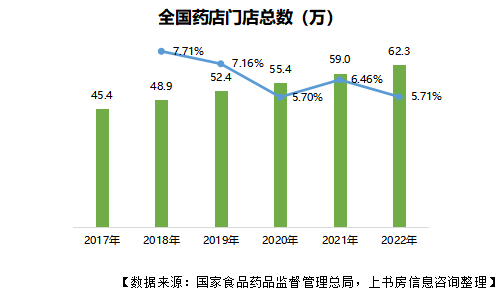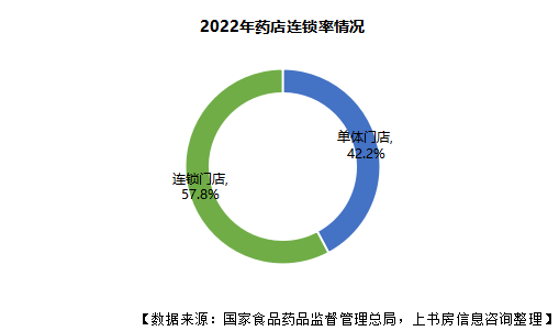 2022年,藥店連鎖化率從2017年的50.5%增加到57.8%,增速較快,但發(fā)達國家相比(美國2021年藥店連鎖率達71.1%),我國藥店連鎖率仍然較低。