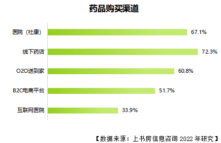 隨著網(wǎng)絡(luò)技術(shù)的發(fā)展,多樣化購藥渠道的出現(xiàn)也在不斷壓榨藥店的生存空間。上書房信息咨詢2022年的調(diào)查數(shù)據(jù)顯示,盡管線下藥店現(xiàn)在仍是居民購藥的主要渠道,但醫(yī)院(社康)和其他線上購藥的渠道滲透率也在不斷提升。