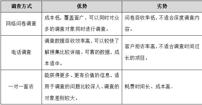 一般制造業(yè)客戶滿意度調(diào)查采取電話調(diào)查、網(wǎng)絡(luò)問卷調(diào)查、一對一面訪這幾種方式居多。這三種調(diào)查方式優(yōu)劣勢如下: