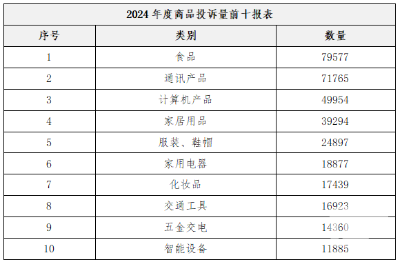 在面向商品的舉報(bào)上,深圳市市場監(jiān)督管理局同樣列舉了前十的商品類別。數(shù)據(jù)顯示,2024年消費(fèi)者對家居用品的舉報(bào)最多,高達(dá)36808件;其次是食品類,舉報(bào)數(shù)量為19393件;然后是通訊產(chǎn)品類,舉報(bào)數(shù)量為10433件。具體類別及數(shù)量可見下表。