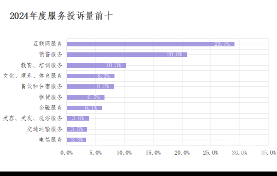 選取2024年度服務(wù)投訴量前十進(jìn)行分析,市場監(jiān)督管理局?jǐn)?shù)據(jù)顯示,消費(fèi)者對互聯(lián)網(wǎng)服務(wù)的投訴量最多,達(dá)70820件;其次是銷售服務(wù),達(dá)50794件;然后是教育、培訓(xùn)服務(wù),投訴量為25042件,消費(fèi)者對這幾類服務(wù)還存在較多不滿。
